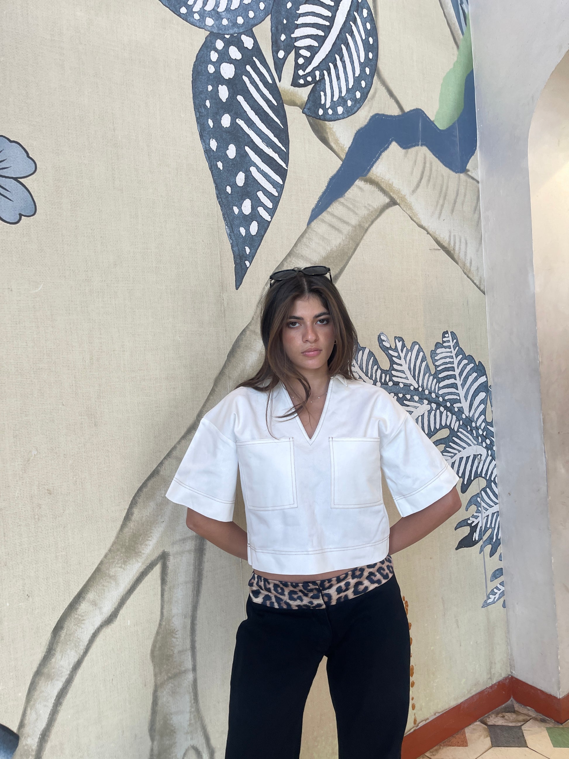Clean lines meet structured elegance in this versatile gabardine top. Crafted from a durable, smooth-touch fabric, this boxy silhouette features oversized front patch pockets and a sharp V-neckline that adds a tailored edge.